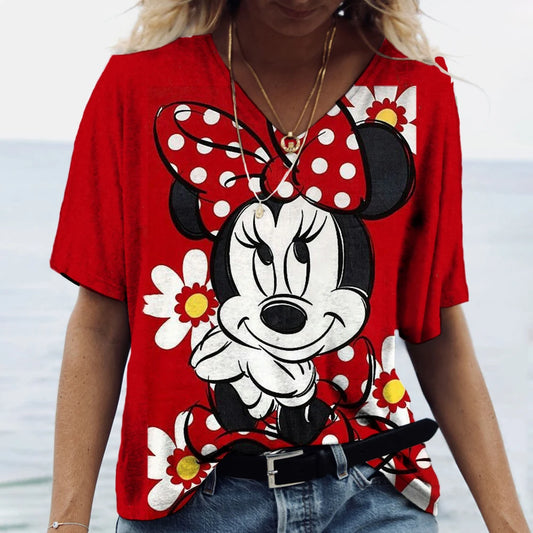 Disney Mickey Mouse Minnie Print T Shirts Short Sleeve V Neck For Women Lightweight Soft Casual
