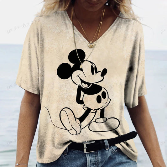 Women's Disney Mickey Mouse Print Vintage T Shirts V Neck Casual Short Sleeve