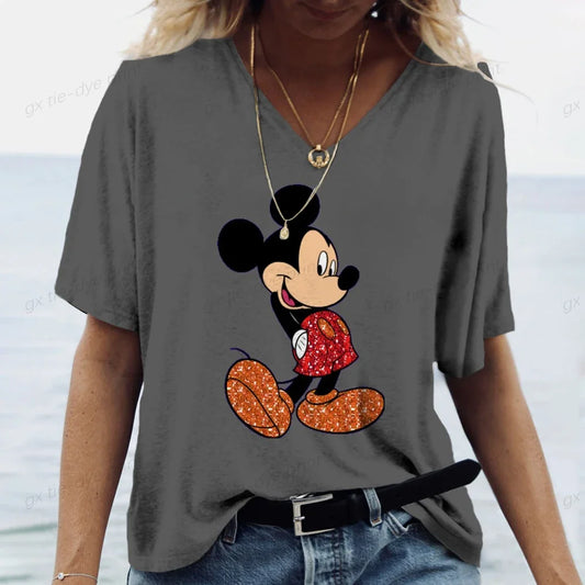 Women's Funny 3d Disney Mickey Mouse Print T-Shirt V-Neck Short Sleeve