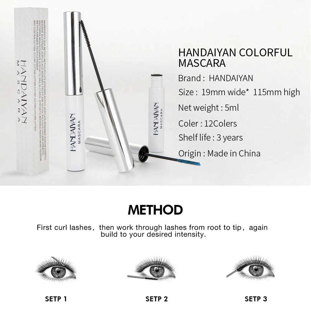 Transform your eye makeup with this versatile 12-color waterproof mascara designed for bold, expressive looks. Each shade—from classic black and white to vibrant blue, red, and purple—delivers rich pigmentation and exceptional color payoff, making it ideal for festivals, stage performances, and creative makeup artistry. The fast-drying formula resists smudging, fading, and moisture, ensuring your eye makeup stays flawless throughout the day. Beyond lashes, use it to define and color eyebrows for a coordinated, polished appearance. With its waterproof and sweat-resistant properties, this mascara maintains its intensity whether you're performing under stage lights or navigating humid conditions. Universal compatibility makes it suitable for all skin types, while the lightweight 5g formula provides excellent value. Achieve dramatic curls and lash extension effects with professional-grade results that won't compromise on durability or wear time.