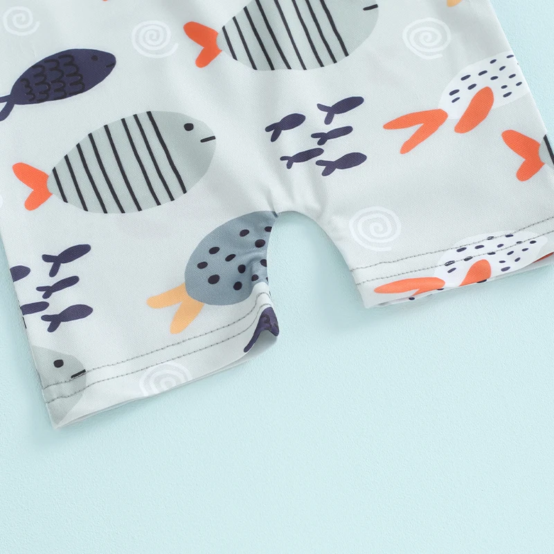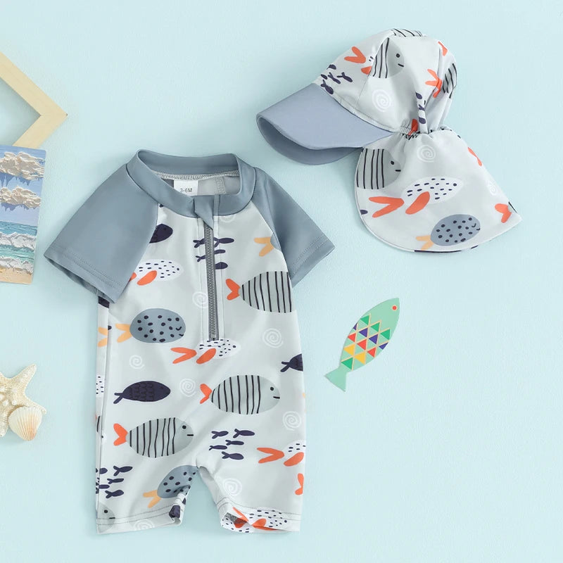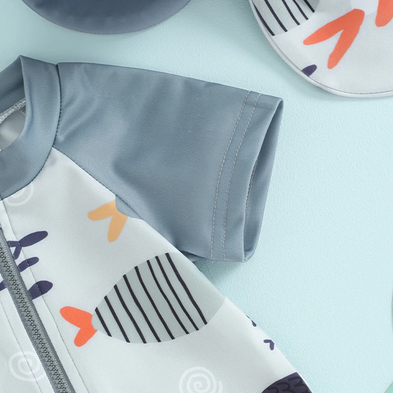 Toddler Boys Rash Guard Swimwear Cartoon Fish Print Short Sleeve Swimsuits Front Zipper Bathing Suits with Swimming Hat