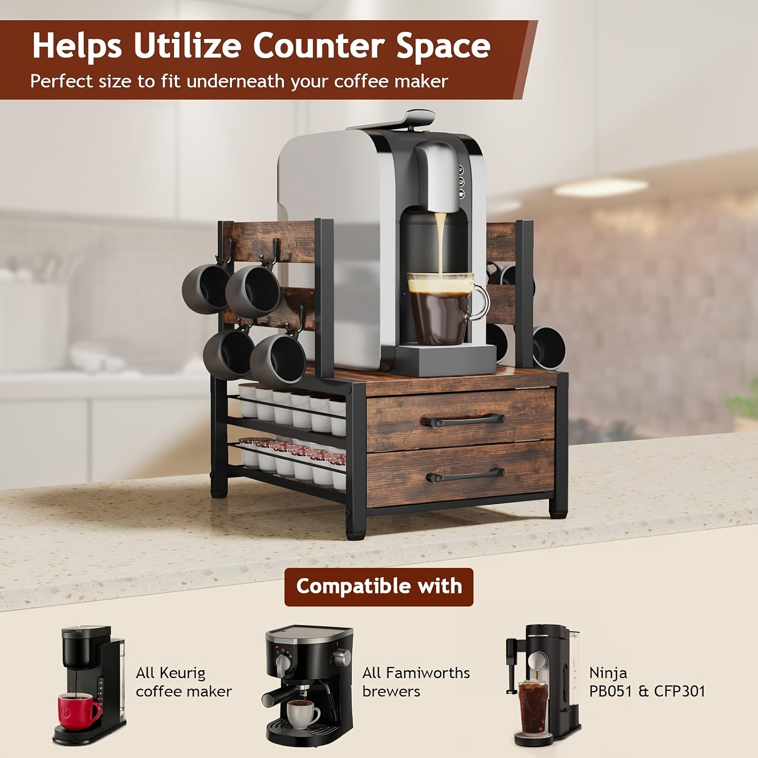 Coffee Capsule Storage Rack And Mug Holder, Double Layer Coffee Machine Stand, K Cup Holder Drawer, 70 Capacity Bean Pod Organizer, Home Kitchen Countertop Organizer, Rustic Brown