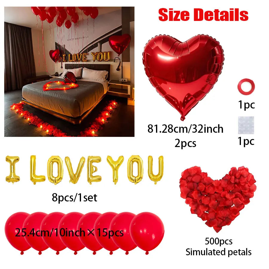 Golden I LOVE YOU Balloon Set with Simulated Petals 32 inch Heart shaped Balloon Wedding Proposal Birthday Decoration