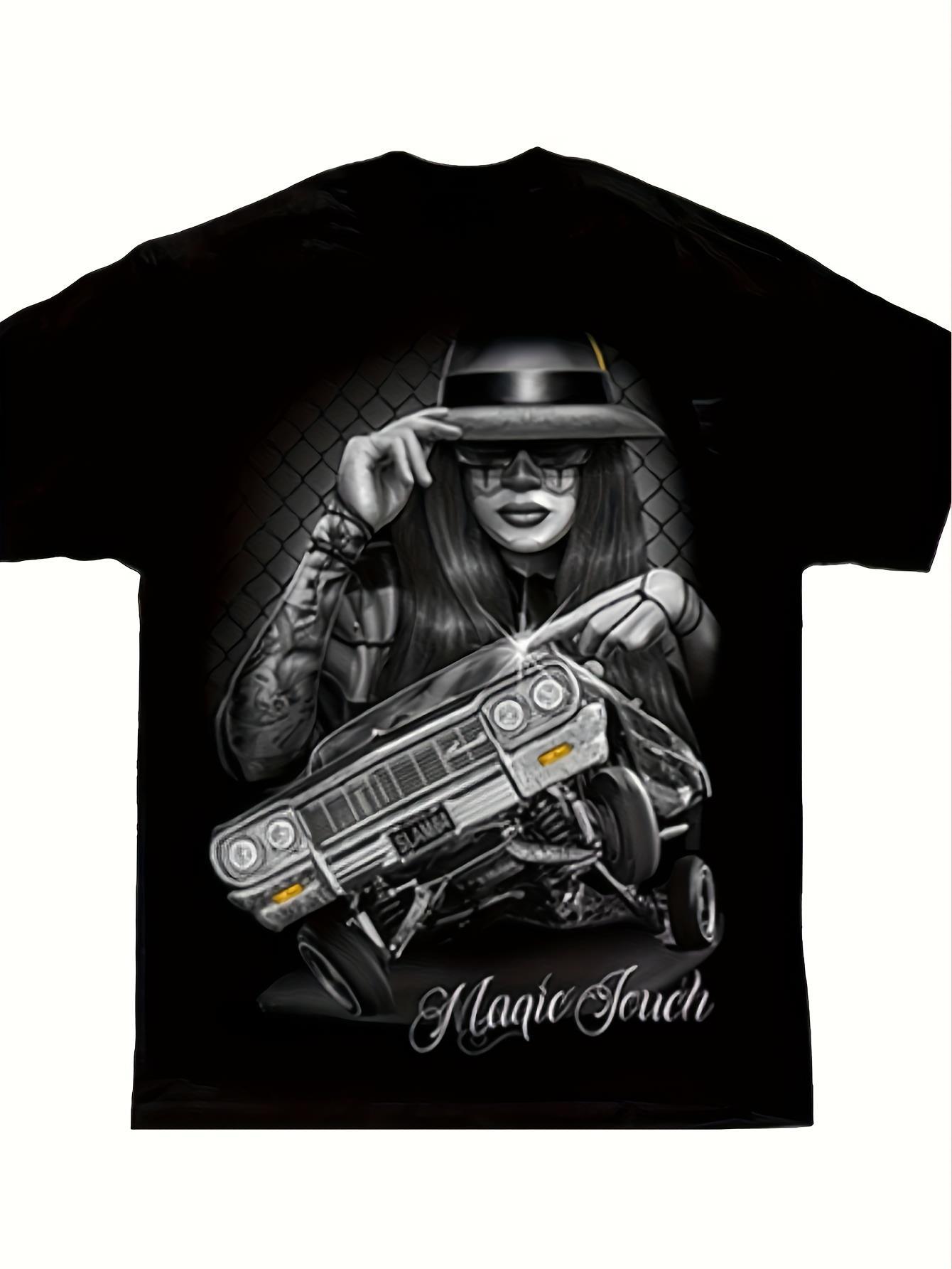 Mens DGA d Gonzales Magic Touch Lowrider Chicano Art T-Shirt | Mexican Folk Art Graphic Tee with Catrina & Lowrider Car Design, Soft Fit Casual Wear, Crew Neck, Short Sleeve, Medium Stretch Fabric, All-Season Wear.