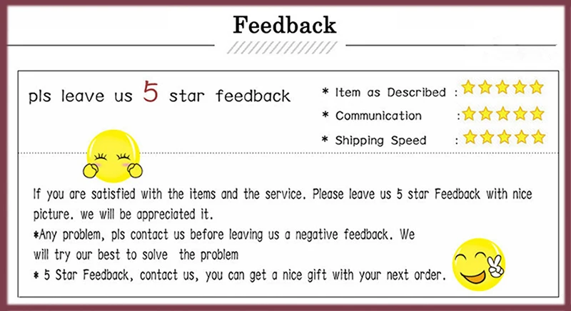 4. Please give 5 stars feedback if you satisfy our products, it is very important for us ,if you have any question , please contact us , we will serve for you on aliexpress .
